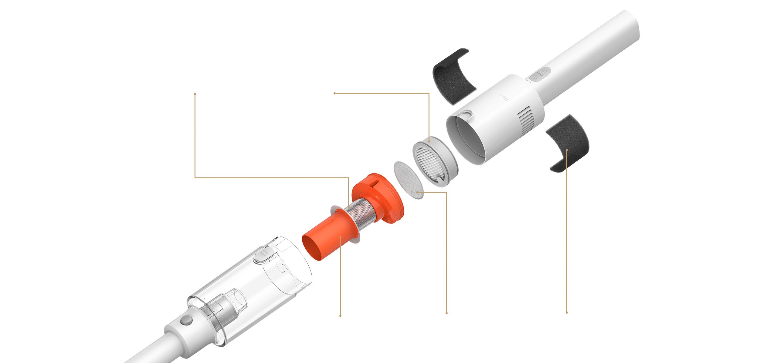 Вертикальный беспроводной пылесос Xiaomi Vacuum Cleaner P30 выполнен в компактном корпусе белого цвета с оранжевыми акцентами. Конструкция цельная, без разборной трубы, что делает устройство более устойчивым и удобным для быстрой уборки. Вес пылесоса составляет 1,46 кг, поэтому им комфортно пользоваться одной рукой и легко переносить между комнатами.